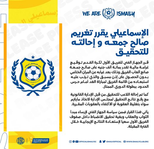 النادي الإسماعيلي، قرر الجهاز الفني للنادي الإسماعيلي، بقيادة أحمد حسام ميدو المدير الفني، توقيع عقوبة مالية قدرها 100 ألف جنيه على صالح جمعة صانع ألعاب الدراويش، بعد غيابه عن المران الأساسي للفريق، مساء اليوم السبت، بدون إذن.