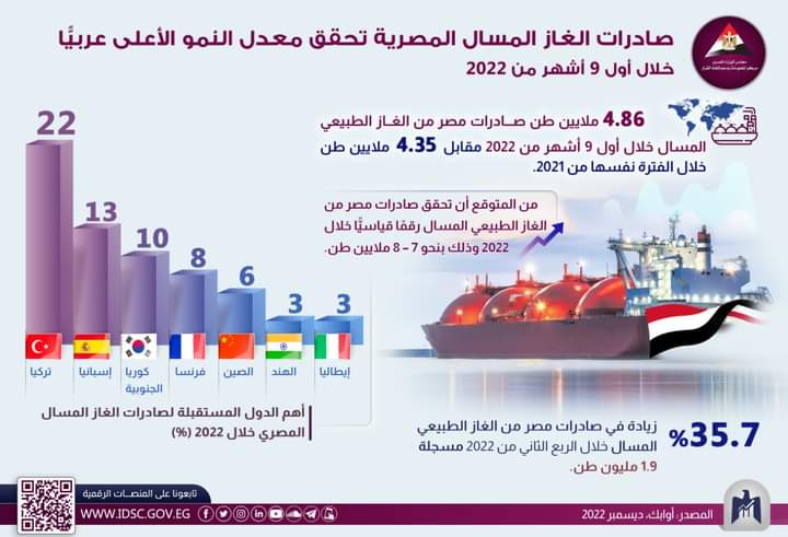 نشر مركز المعلومات ودعم اتخاذ القرار بمجلس الوزراء عبر صفحته الرسمية على موقع التواصل الاجتماعي فيسبوك إنفوجراف جديد تحت عنوان "صادرات الغاز المسال المصرية تحقق معدل النمو الأعلى عربيا خلال أول 9 أشهر من 2022".