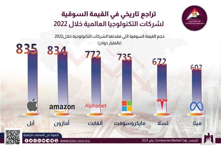 نشر مركز المعلومات ودعم اتخاذ القرار بمجلس الوزراء عبر صفحته الرسمية على موقع التواصل الاجتماعي فيسبوك إنفوجراف جديد تحت عنوان "تراجع تاريخي في القيمة السوقية لشركات التكنولوجيا العالمية خلال عام 2022".