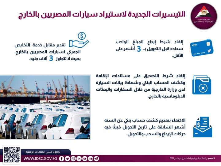 نشر مركز المعلومات ودعم اتخاذ القرار بمجلس الوزراء عبر صفحته الرسمية على موقع التواصل الاجتماعي فيسبوك إنفوجراف جديد تحت عنوان "التيسيرات الجديدة لاستيراد سيارات المصريين بالخارج".