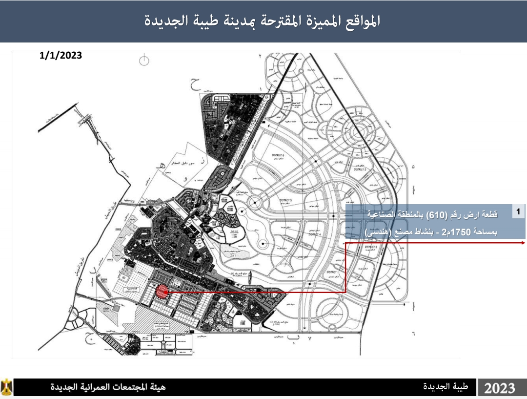 حددت هيئة المجتمعات العمرانية الجديدة قطع الأرض بمدينة طيبة الجديدة بنشاط صناعي قطعة ارض رقم (610) بالمنطقة الصناعية بمساحة 21750 - بنشاط مصنع (هندسي) وسعرها التقديري 680 جنيها مصريا للمتر².