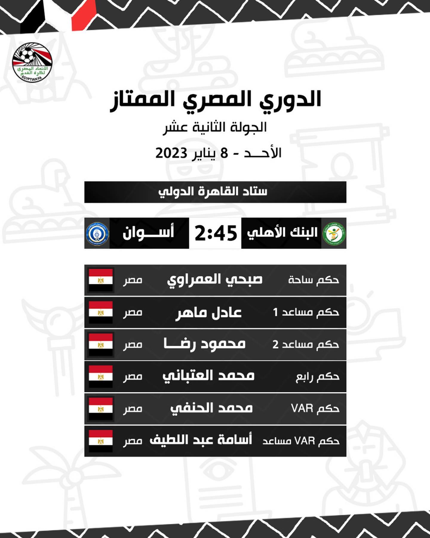 وأعلنت لجنة الحكام الرئيسية في اتحاد الكرة، طاقم تحكيم مباراة البنك الأهلي وأسوان في الأسبوع الـ12 من الدوري الممتاز، وجاء كالتالي: