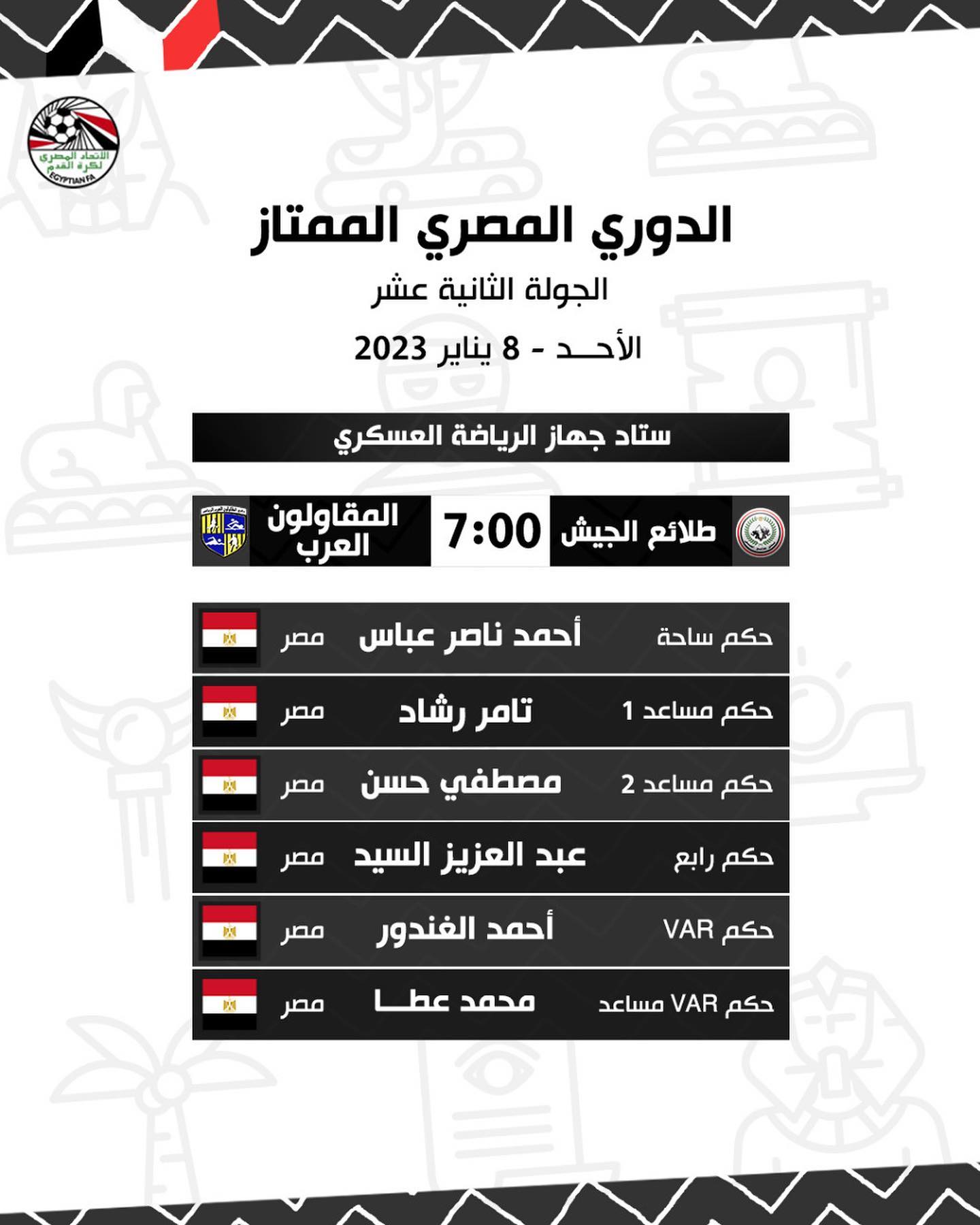 وأعلنت لجنة الحكام الرئيسية في اتحاد الكرة، طاقم تحكيم مباراة طلائع الجيش والمقاولون في الأسبوع الـ12 من الدوري الممتاز، وجاء كالتالي: