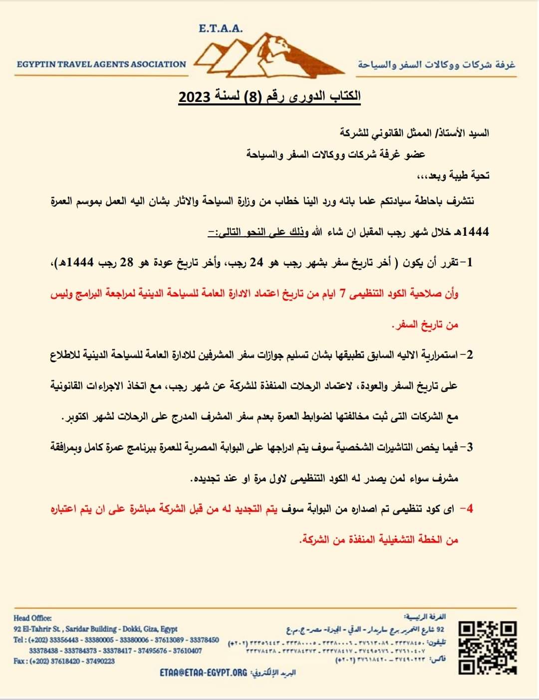 كما قررت الوزارة استمرار الآلية السابق تطبيقها بشأن تسليم جوازات سفر المشرفين للإدارة العامة للسياحة الدينية للإطلاع على تاريخ السفر والعودة لاعتماد الرحلات المنفذة للشركة عن شهر رجب مع اتخاذ الإجراءات القانونية مع الشركات التي ثبت مخالفتها لضوابط العمرة بعدم سفر المشرف المدرج على الرحلات لشهر أكتوبر.