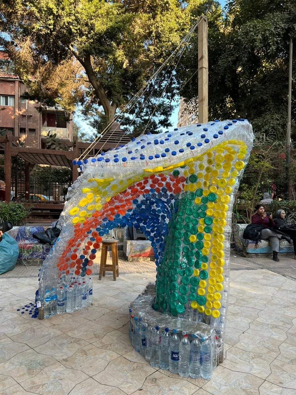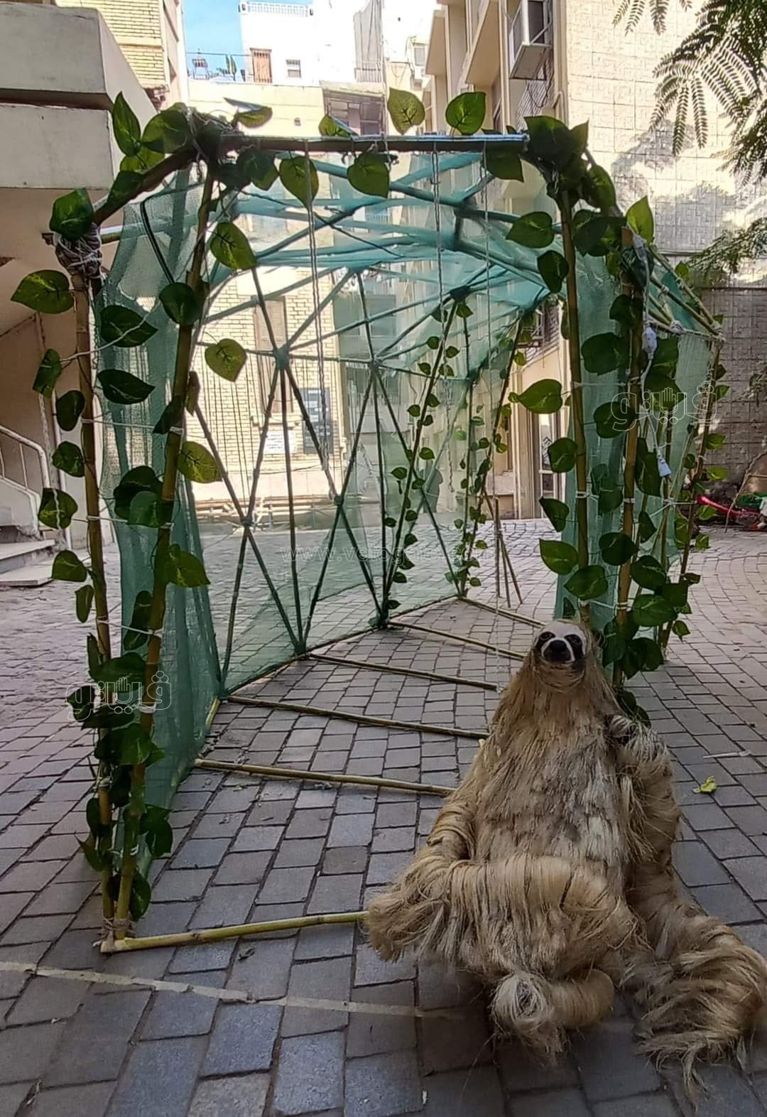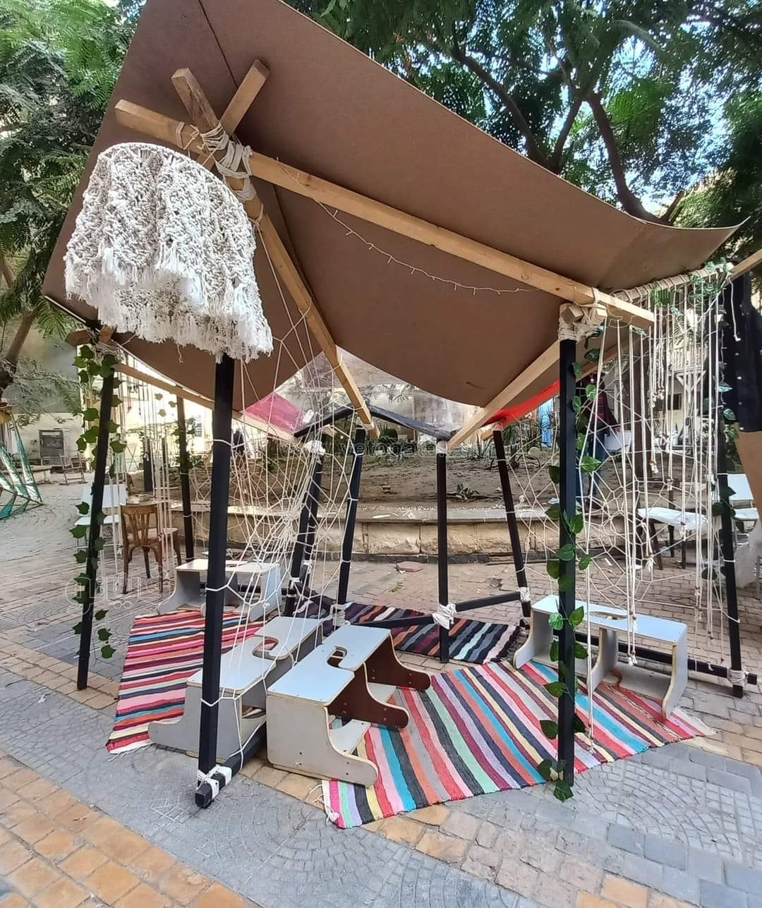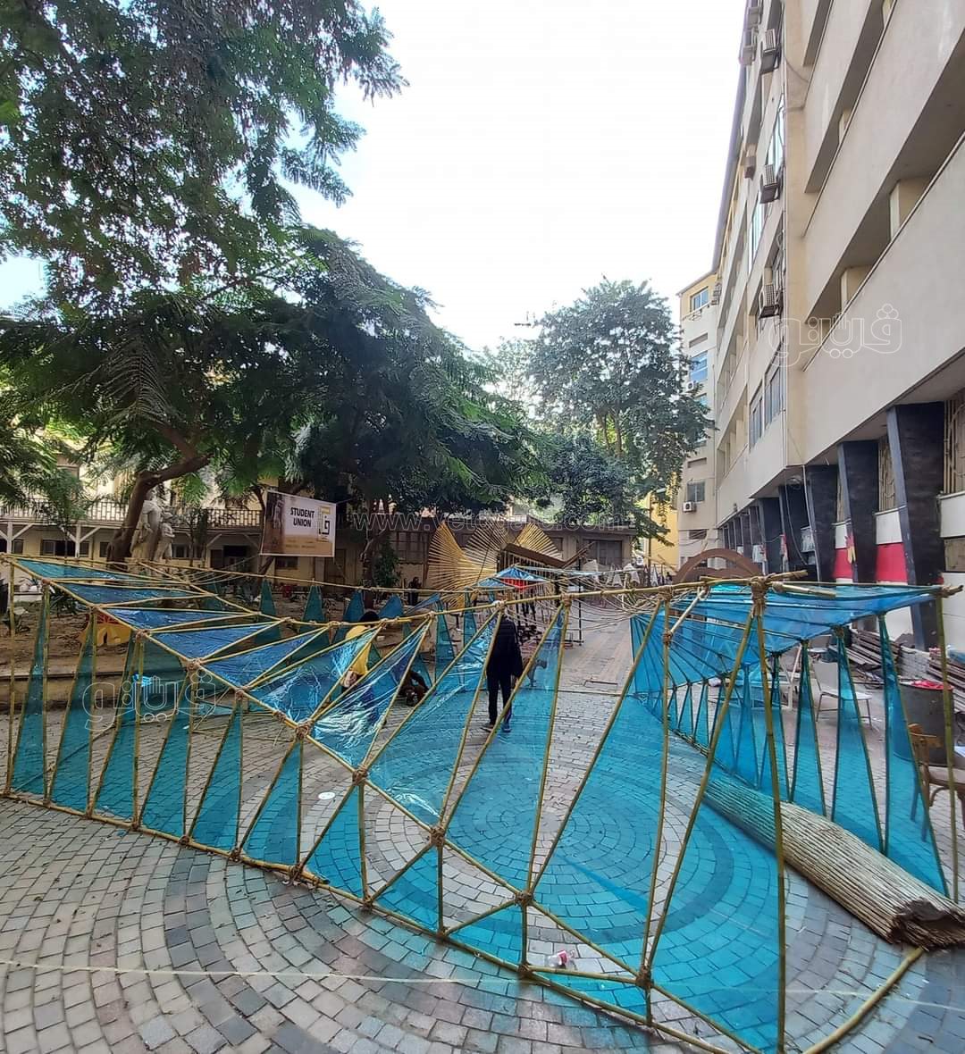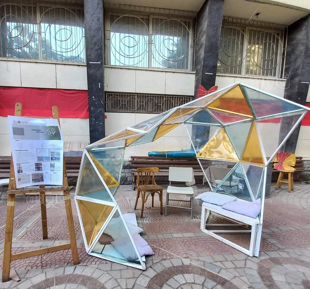 - تثبيت النظام الإنشائي ( frames ) عن طريق الحبال فقط، هاند ميد مع إستعمال إجزاء الكراسي الغير مستغلة بالكلية وإعادة تدوير وعمل مقاعد صالحة للإستخدام والجلوس داخل التغطية الخاصة بالمشروع.