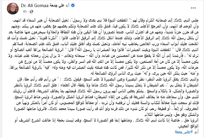 وكتب الدكتور علي جمعة تدوينة على الفيس بوك عن المبشرات والرؤيا الصالحة فقال: "جلس النبي ﷺ إلى صحابته الكرام وقال لهم:" انقطعت النبوة فلا نبي بعدى ولا رسول"، تخيل الصحابة أن خبر السماء قد انتهى، وأن الوحى قد انتهى، وأن المرجع الأعلى ﷺ لا يكون فينا"