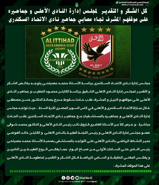 مجلس إدارة نادي الاتحاد السكندري برئاسة محمد مصيلحي، يتوجه بخالص الشكر والتقدير لمجلس إدارة النادي الأهلي الشقيق برئاسة الكابتن محمود الخطيب، وجماهير النادي الأهلي على موقفهم النبيل والمشرف عقب حادث سقوط مدرج بصالة الدكتور حسن مصطفى، خلال مباراة الاتحاد السكندري والأهلي في كأس السوبر المصري لكرة السلة.