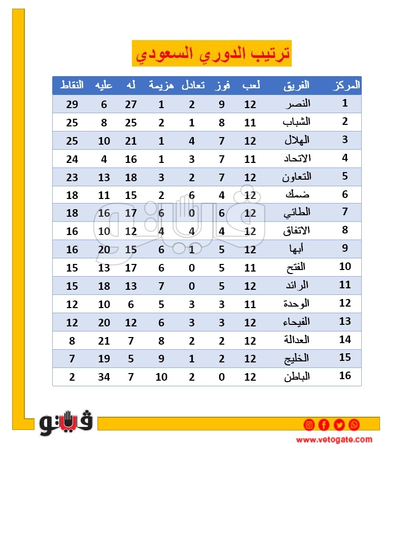 ترتيب الدوري السعودي، تنشر فيتو جدول ترتيب الدوري السعودي، بعد انتهاء الجولة الـ 12 للمسابقة والتي يتصدرها النصر السعودي الذي يضم بين صفوفه البرتغالي كريستيانو رونالدو.