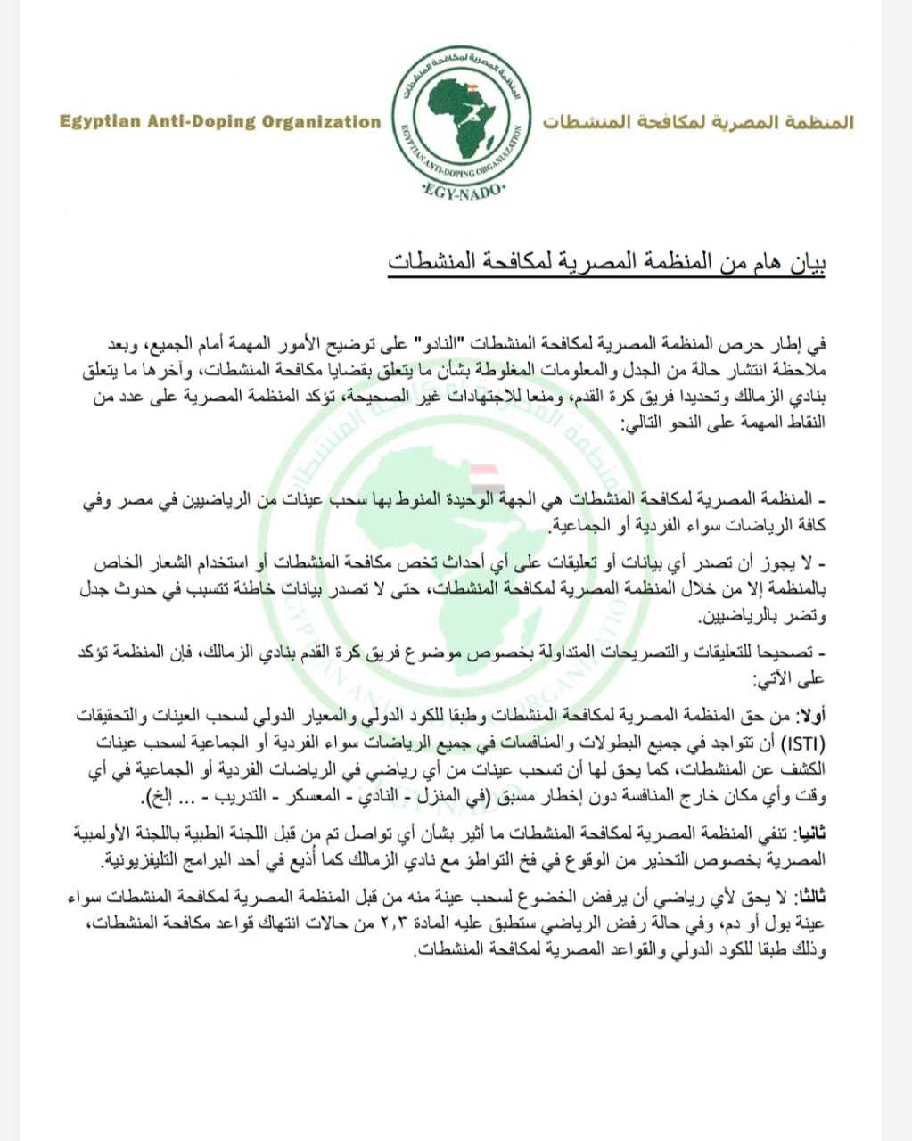 وقال البيان:في إطار حرص المنظمة المصرية لمكافحة المنشطات "النادو" على توضيح الأمور المهمة أمام الجميع، وبعد ملاحظة انتشار حالة من الجدل والمعلومات المغلوطة بشأن ما يتعلق بقضايا مكافحة المنشطات، وآخرها ما يتعلق بنادي الزمالك وتحديدا فريق كرة القدم، ومنعا للاجتهادات غير الصحيحة، تؤكد المنظمة المصرية على عدد من النقاط المهمة على النحو التالي: