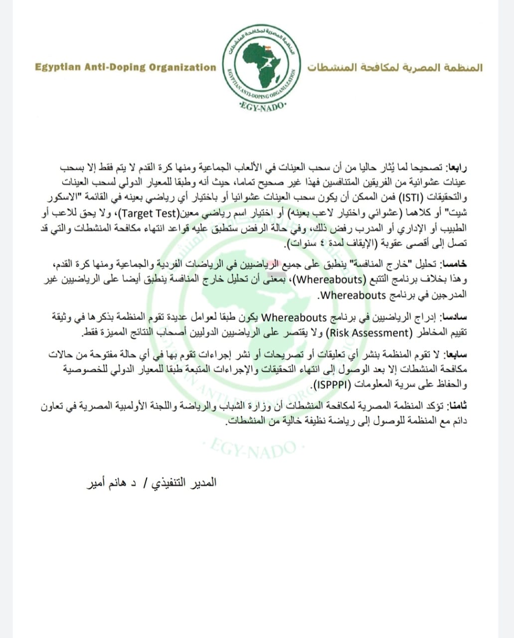 رابعا: تصحيحا لما يُثار حاليا من أن سحب العينات في الألعاب الجماعية ومنها كرة القدم لا يتم فقط إلا بسحب عينات عشوائية من الفريقين المتنافسين فهذا غير صحيح تماما، حيث أنه وطبقا للمعيار الدولي لسحب العينات والتحقيقات (ISTI) فمن الممكن أن يكون سحب العينات عشوائيا أو باختيار أي رياضي بعينه في القائمة "الاسكور شيت" أو كلاهما (عشوائي واختيار لاعب بعينه) أو اختيار اسم رياضي معين(Target Test)، ولا يحق للاعب أو الطبيب أو الإداري أو المدرب رفض ذلك، وفي حالة الرفض ستطبق عليه قواعد انتهاء مكافحة المنشطات والتي قد تصل إلى أقصى عقوبة (الإيقاف لمدة 4 سنوات).