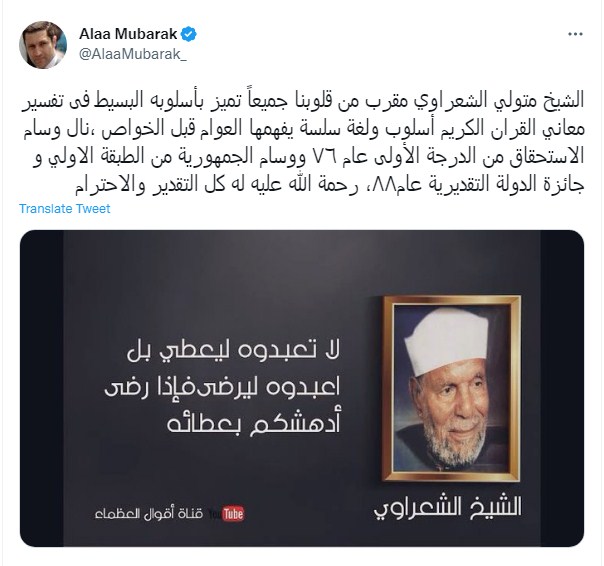 ووجه علاء مبارك رسالة، عبر موقع التواصل الاجتماعي تويتر، للشيخ متولي الشعراوي فقال: "الشيخ متولي الشعراوي مقرب من قلوبنا جميعًا تميز بأسلوبه البسيط فى تفسير معاني القران الكريم أسلوب ولغة سلسة يفهمها العوام قبل الخواص"