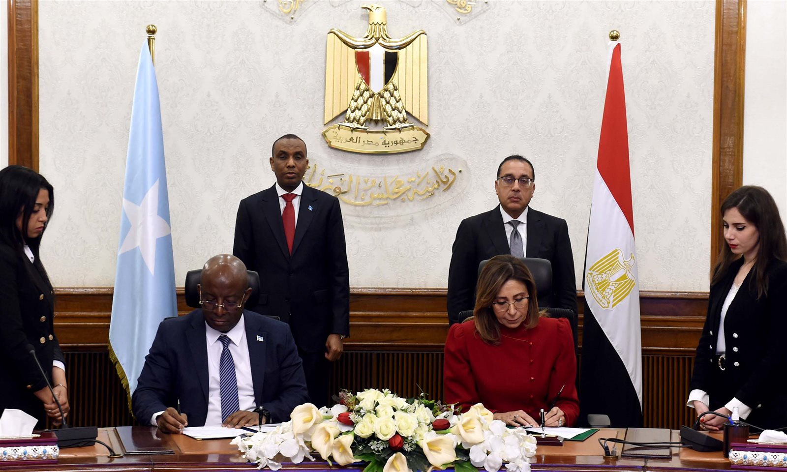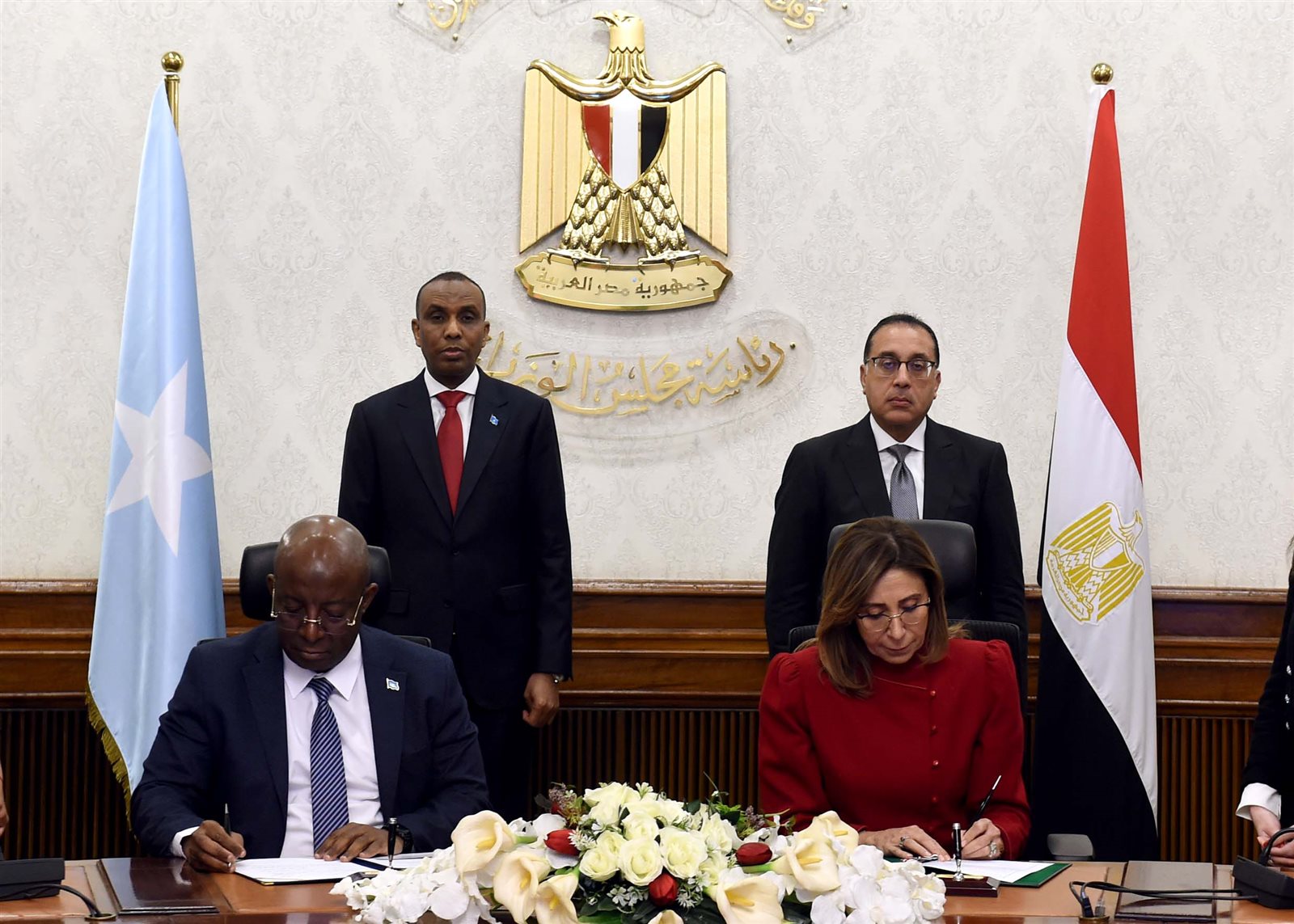 شهد الدكتور مصطفى مدبولي، رئيس مجلس الوزراء، وحمزة عبدي بري، رئيس وزراء جمهورية الصومال الفيدرالية، مراسم التوقيع على مذكرة تفاهم بين "وزارة الثقافة" المصرية، ووزارة "الإعلام والثقافة والسياحة" بحكومة جمهورية الصومال الفيدرالية؛ وذلك لتعزيز التعاون الثقافي المشترك بين البلدين.
