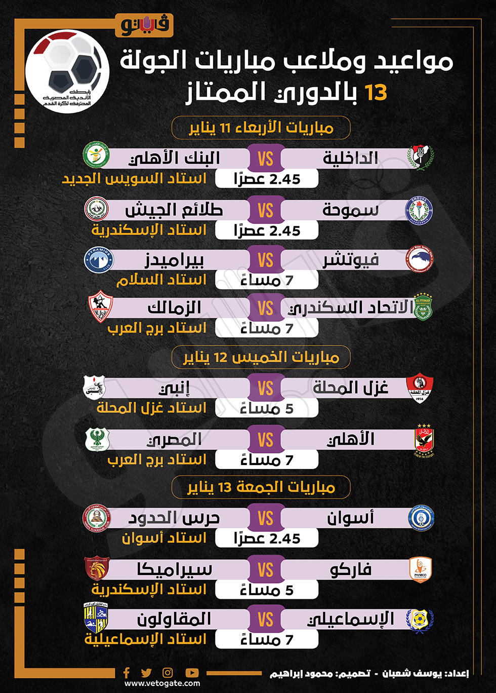 مواعيد وملاعب مباريات الجولة 13 بالدوري الممتاز | إنفوجراف الإثنين 09/يناير/2023 - 10:00 م 1/9/2023 10:00:13 PM فريق الكرة بالنادي الأهلي، فيتو يوسف شعبان شارك طباعة 18 حجم الخط شارك طباعة الدوري الممتاز مواعيد مباريات الجولة 13 بالدوري الممتاز الأهلي الزمالك المصري الاتحاد السكندري