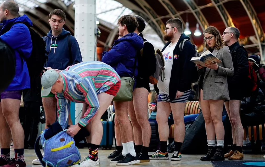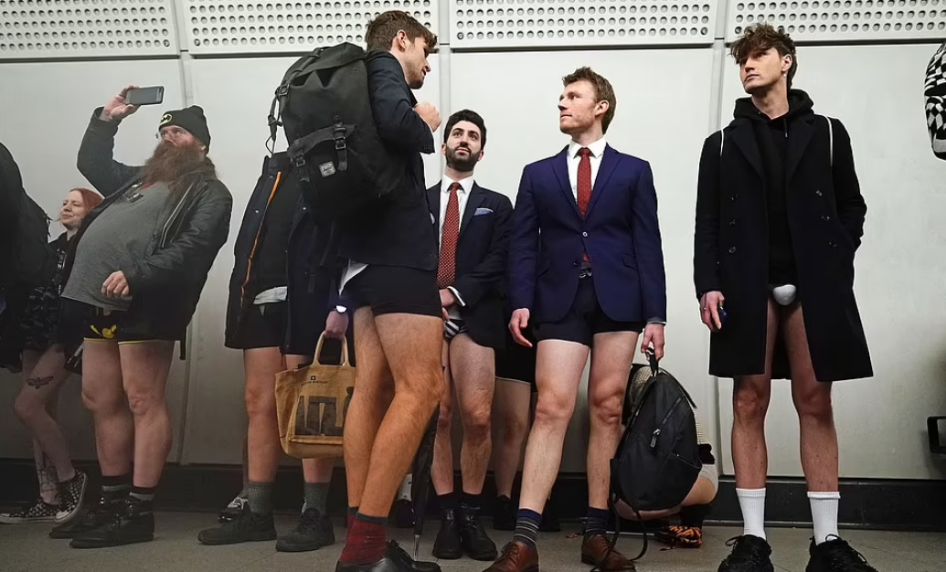 تجرد المئات من سكان لندن من سراويلهم لدى ركوبهم مترو الأنفاق، للمشاركة في مهرجان No Trousers Tube Ride أو "يوم بدون سراويل"، الذي يعود بعد انقطاع بسبب الجائحة كورونا.