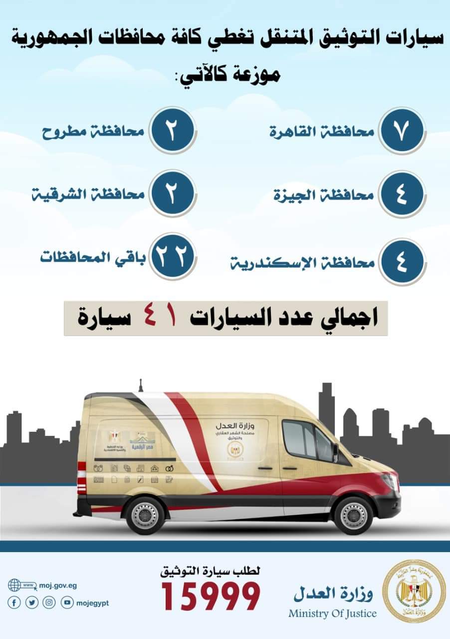 أكدت وزارة العدل برئاسة المستشار عمر مروان أن سيارات التوثيق المتنقل تغطي كافة محافظات الجمهورية، وهي محافظات القاهرة، الجيزة، مطروح، الجيزة، الشرقية، الإسكندرية، بالإضافة إلى باقي المحافظات، بإجمالي عدد السيارات 41 سيارة.