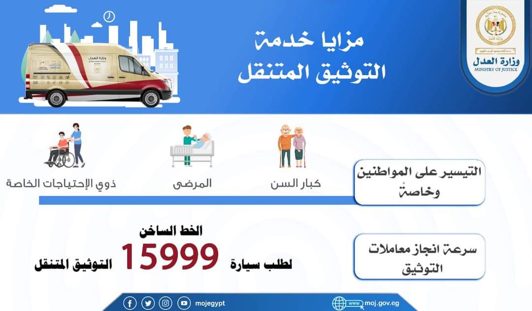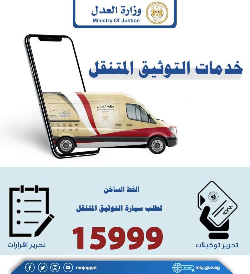 وأطلقت وزارة العدل إشارة بدء تشغيل سيارات التوثيق متنقلة في بعض محافظات الجمهورية، والمجهزة بكافة المعدات والأجهزة الحديثة، والتي تعمل على تقديم الخدمة لطالبيها بصورة حضارية، تدعيمًا لفروع التوثيق المزدحمة وتيسيرًا على المواطنين وللحد من الزحام.