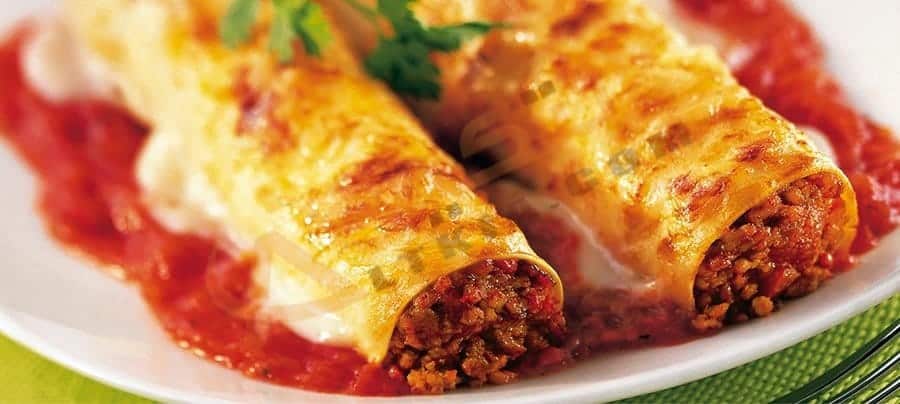-بعدها نحضر صينية، ونحشو الكنيلونى باللحم ونلفه رول، ثم نرصه في الصينية.