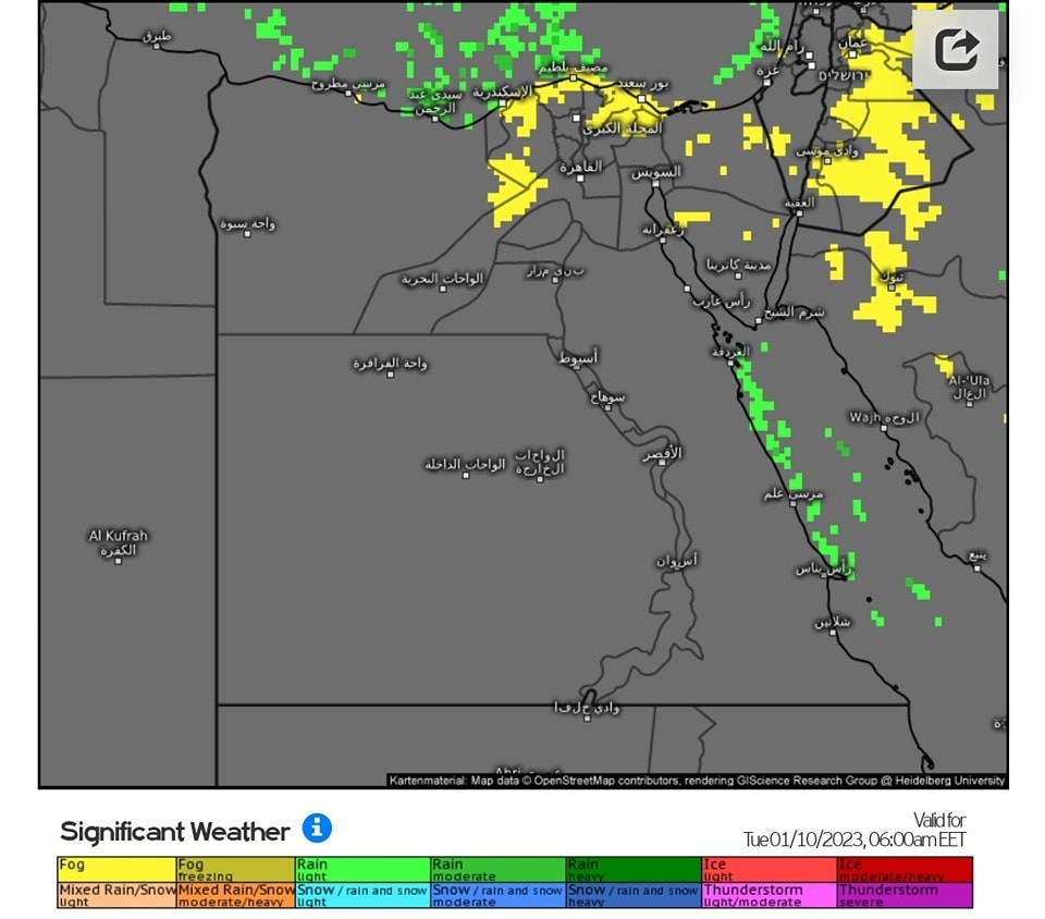 وتوقعت هيئة الأرصاد، سقوط أمطار خفيفة على مناطق من السواحل الشمالية الغربية بنسبة حدوث 30% وفرص لسقوط أمطار على سلاسل جبال البحر الأحمر على فترات متقطعة بنسبة حدوث 30 %، ونشاط رياح على مناطق من السواحل الشمالية الغربية علي فترات متقطعة.