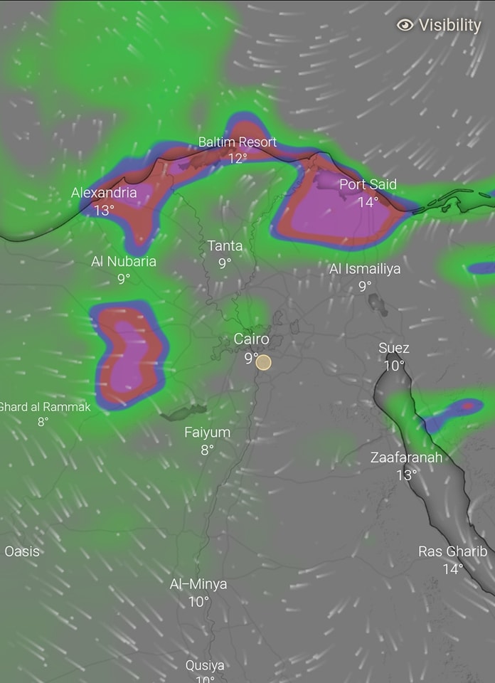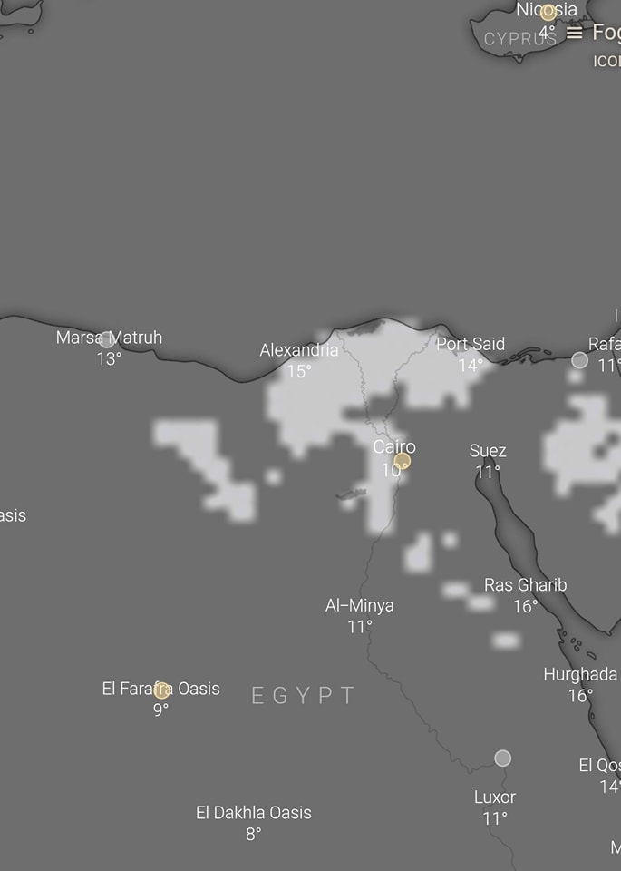 ومن المتوقع للحالة الجوية، حدوث شبورة مائية في الصباح الباكر قد تكون كثيفة أحيانًا على بعض الطرق المؤدية من وإلى القـــاهرة الكبرى والوجه البحري والسواحل الشمالية ومدن القناة ووسط سيناء وشمال الصعيد، ونشاط للرياح على مناطق من السواحل الشمالية الغربية وجنوب سيناء وجنوب البلاد على فترات متقطعة.