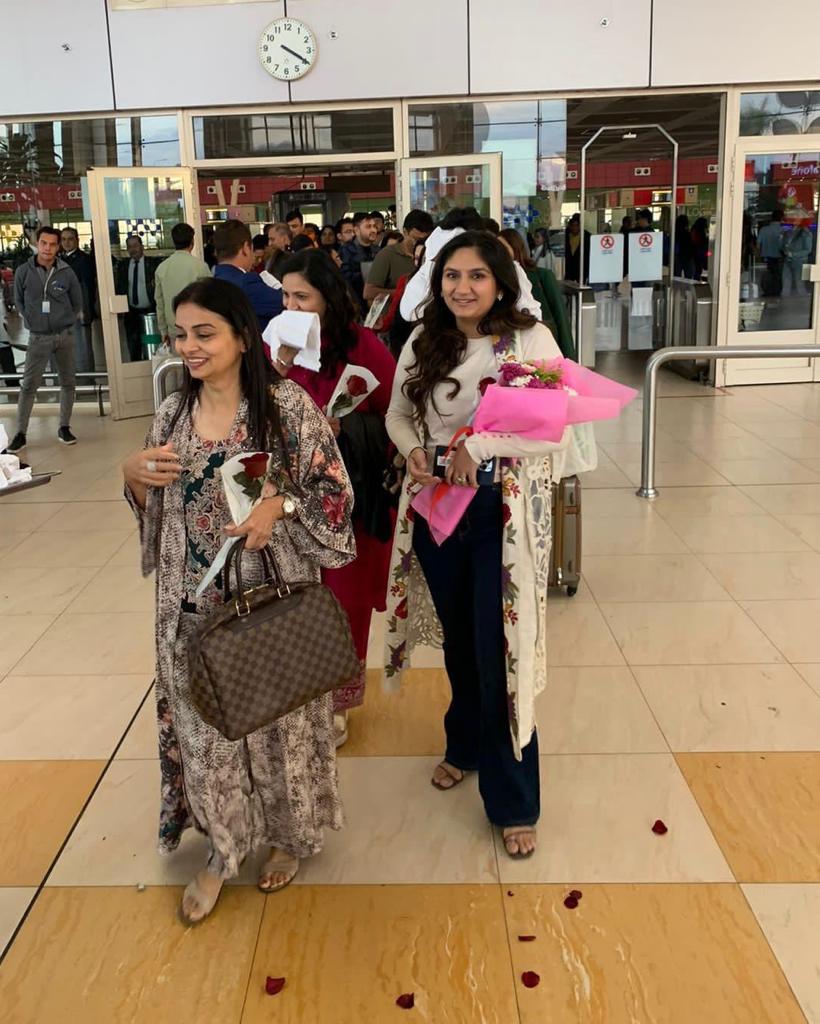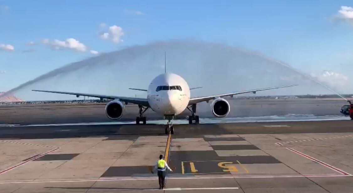 واستقبلت سلطات مطار شرم الشيخ الدولي الطائرة بتقليد رش المياه، والترحيب بالركاب والضيوف والعروسين وتقديم الورود وعزف الموسيقي، تعبيرًا عن حفاوة الاستقبال.