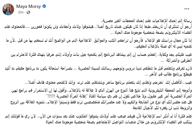 رسالة مايا مرسي للمحطة التليفزيونية
