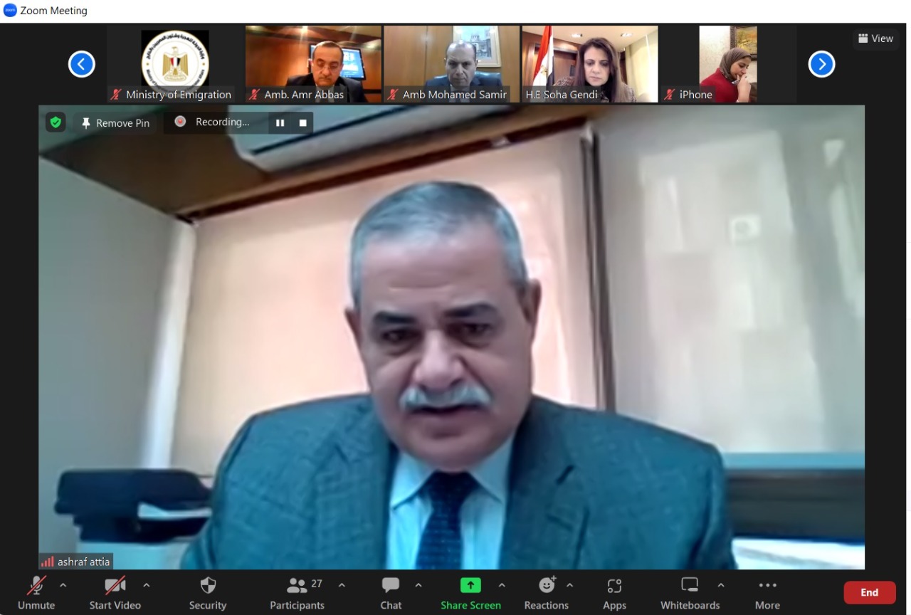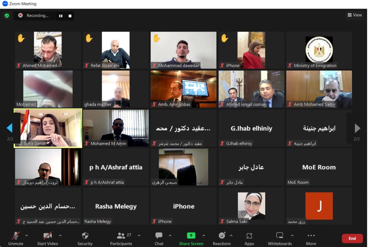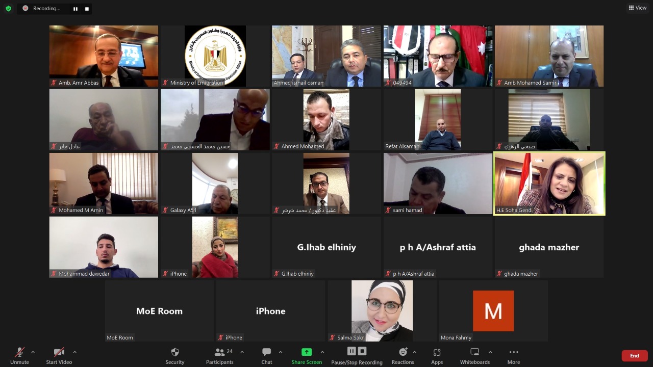 عقدت السفيرة سها جندي، وزيرة الدولة للهجرة وشئون المصريين بالخارج، لقاء افتراضيا مع الجالية المصرية في الأردن، ضمن مبادرة "ساعة مع الوزيرة"، معربة عن تهنئتها لجميع المصريين بالخارج بمناسبة العام الجديد والأعياد، جاء اللقاء بمشاركة السفير محمد سمير، سفير مصر في الأردن، والسفير أحمد إسماعيل، قنصل مصر العام في العقبة، والسفير عمرو عباس، مساعد وزيرة الهجرة للجاليات، وممثلي عدد من ممثلي وزارات ومؤسسات الدولة المصرية.