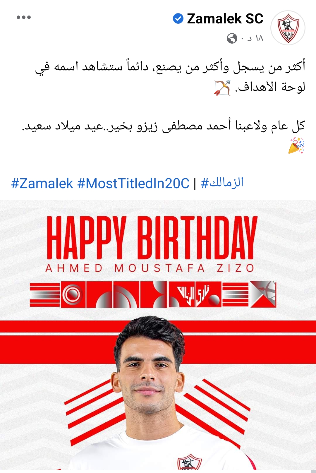 وكتب الحساب الرسمي للزمالك: أكثر من يسجل وأكثر من يصنع، دائمًا ستشاهد اسمه في لوحة الأهداف. كل عام ولاعبنا أحمد مصطفى زيزو بخير..عيد ميلاد سعيد.