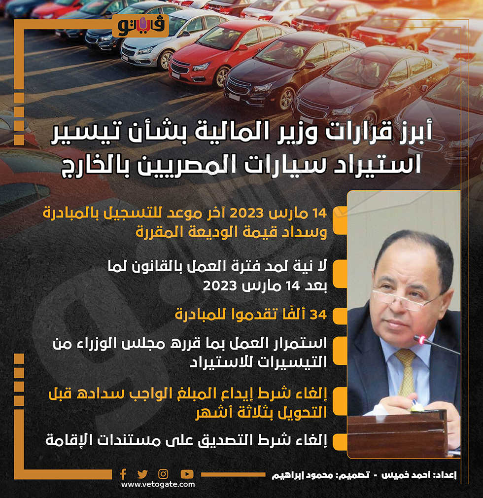 أبرز قرارات وزير المالية بشأن تيسير استيراد سيارات المصريين بالخارج (إنفوجراف) الثلاثاء 10/يناير/2023 - 06:22 م 1/10/2023 6:22:14 PM سيارات المصريين بالخارج، فيتو أحمد خميس شارك طباعة 18 حجم الخط شارك طباعة سيارات المصريين بالخارج المصريين بالخارج استيراد سيارات المصريين بالخارج تيسير استيراد سيارات المصريين بالخارج استيراد سيارات المصريين وزير المالية قرارات وزير المالية