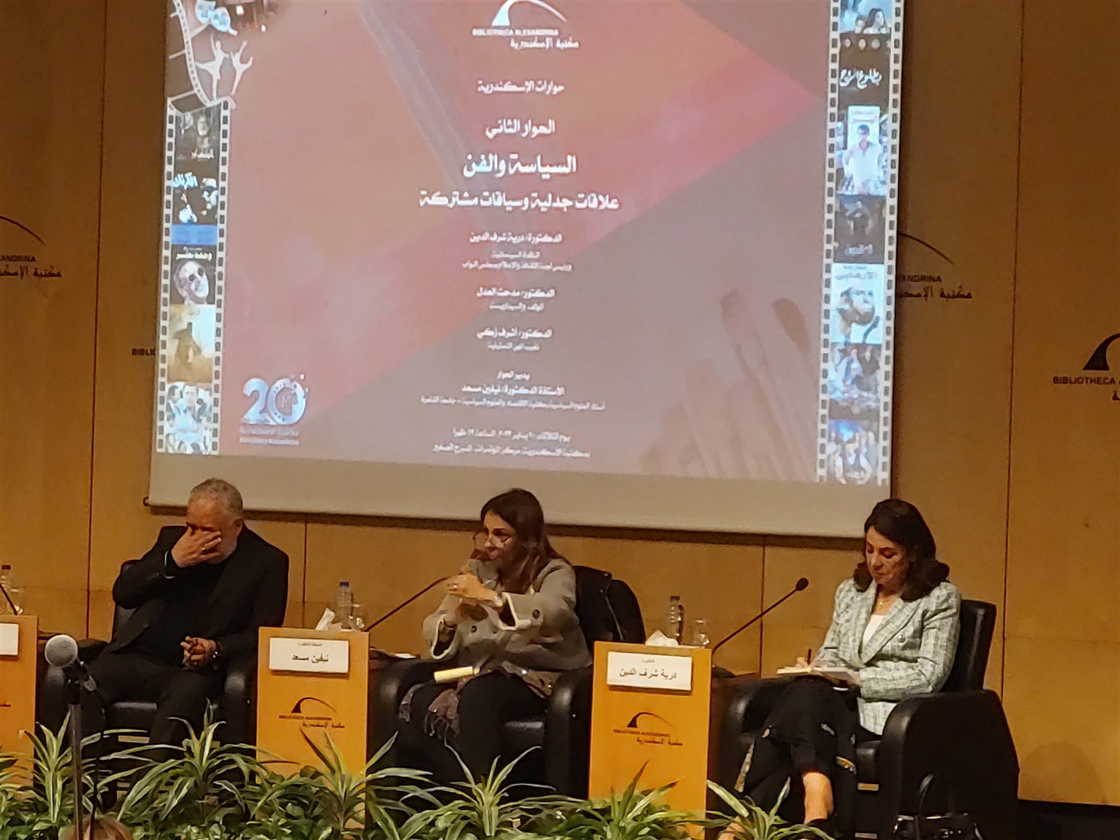 افتتح الدكتور أحمد زايد؛ مدير مكتبة الإسكندرية، والناقدة السينمائية الدكتورة درية شرف الدين؛ رئيس لجنة الثقافة والإعلام بمجلس النواب، والدكتور أشرف زكى؛ نقيب المهن التمثيلية،الحوار الثاني من منتدي "حوارات الإسكندرية" تحت عنوان "السياسة والفن: علاقات جدلية وسياقات مشتركة