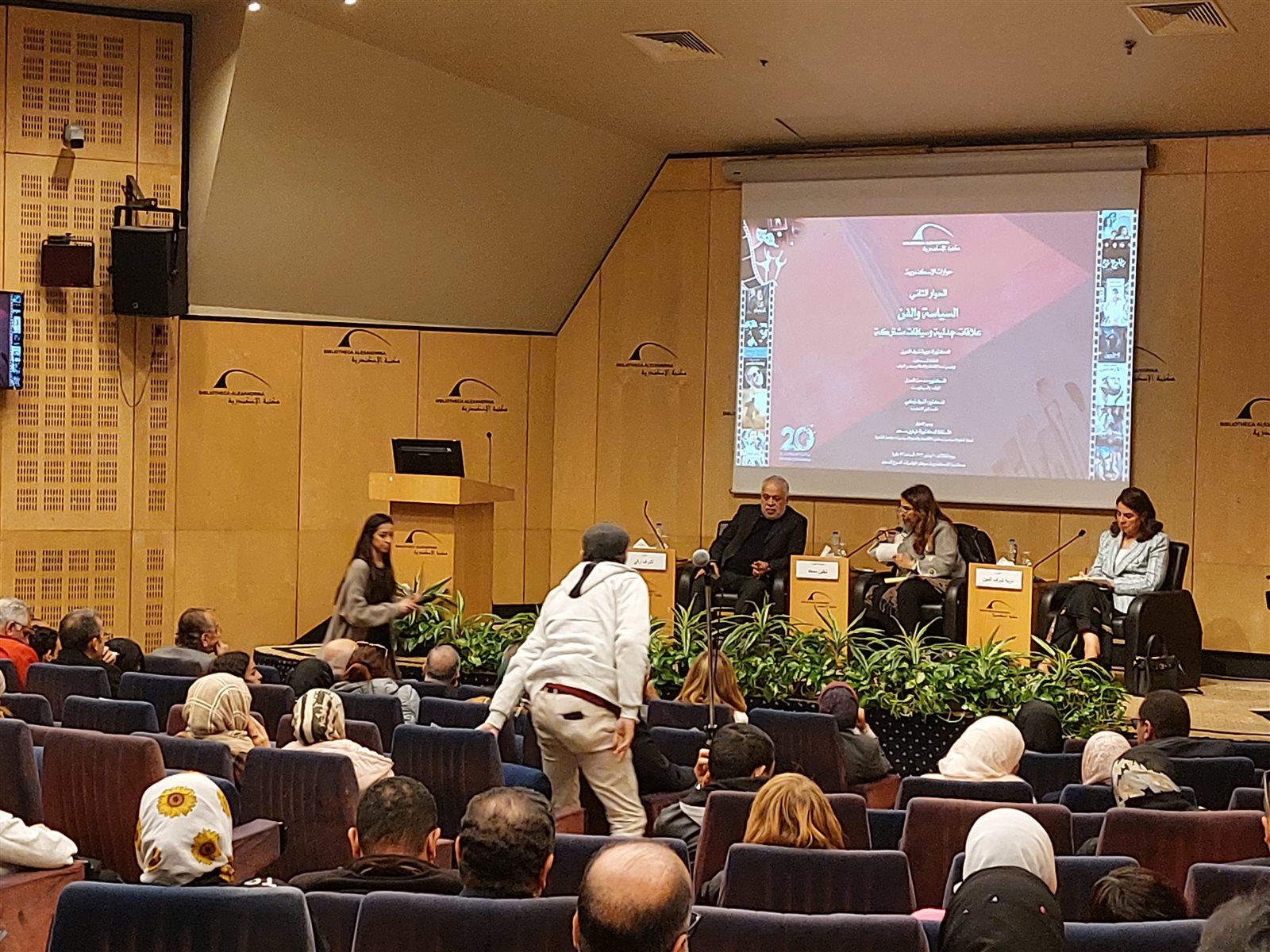 أدارت الحوار الدكتورة نيفين مسعد؛ أستاذ العلوم السياسية بكلية الاقتصاد والعلوم السياسية بجامعة القاهرة، وذلك بحضور مجموعة من كبار المتخصصين على المستويين الأكاديمي والفني، للنقاش حول قضايا السياقات المشتركة والعلاقات الجدلية بين السياسة والفن.