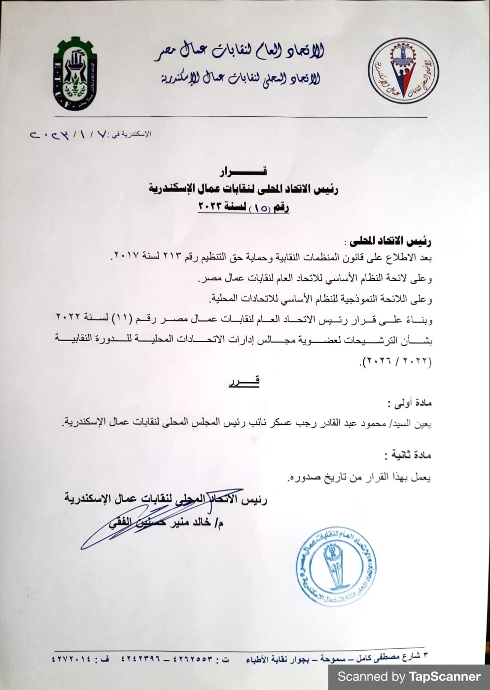 أصدر المهندس خالد منير الفقي، نائب رئيس اتحاد عمال مصر، ورئيس اتحاد عمال الإسكندرية، قرار ١٥ لسنه ٢٠٢٣ بتعيين محمود عسكر رئيس نقابة العاملين بمكتبة الإسكندرية وعضو مجلس إدارة إتحاد عمال الإسكندرية، نائب لرئيس إتحاد عمال الإسكندرية، وذلك في إطار حركة التجديد والتغيير داخل مجلس إتحاد عمال الإسكندرية لدفع عجلة العمل داخله.