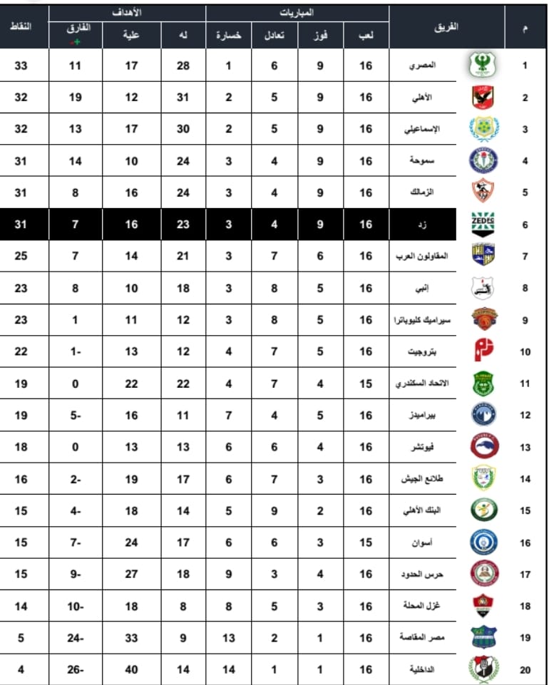 ترتيب دوري الجمهورية للشباب مواليد 2003 بعد الجولة الـ 16