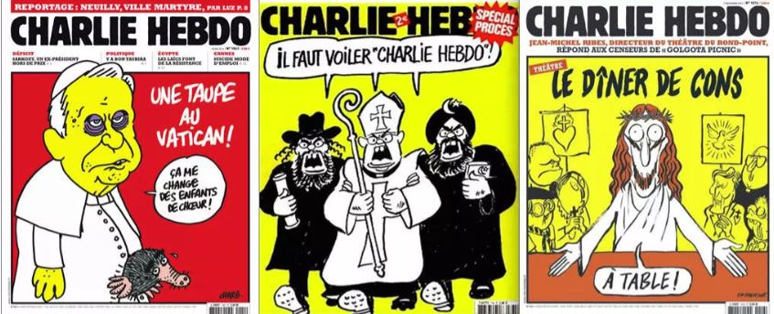وفي 2011، خصصت "شارلي إيبدو" غلافها للسيد المسيح عليه السلام، وتطاولت عليه، كذلك في 2012 كرست "شارلي إيبدو" جهودها للسخرية من فضيحة تسريب وثائق هامة من الفاتيكان في تلك السنة، ورسمت في ذلك العدد على غلافها بابا الكنيسة الكاثوليكية السابق تحت عنوان "جاسوس في الفاتيكان".
