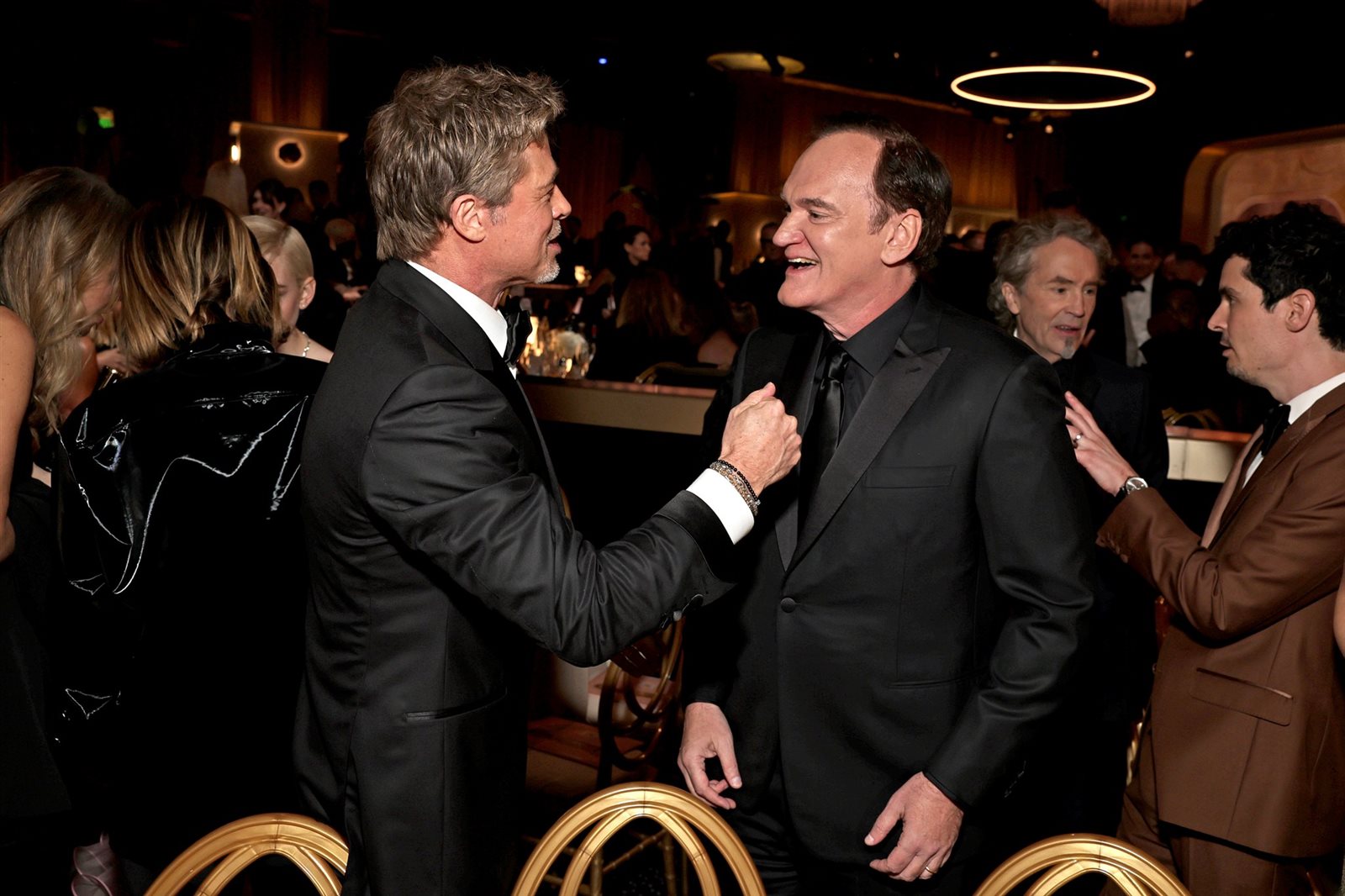 والتقطت عدسات الكاميرات، لحظة وصولهما إلى قاعة حفل الجولدن جلوب، حيث ذهب براد بيت على الفور لتحية صديقه المخرج الشهير كوينتين تارانتينو.