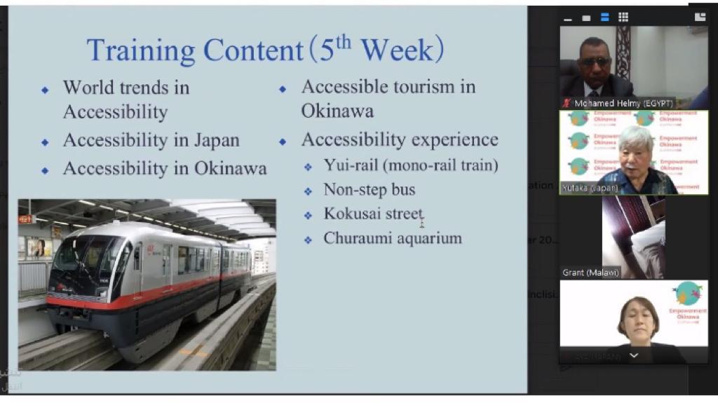 كما تم مناقشة الخطوط العريضة لسياسة الرعاية الاجتماعية والتوظيف وتدابير الدعم في اليابان، وعرض أنشطة منظمة المعوقين في «ولاية أوكيناوا- اليابان»، ودورها في تعزيز المشاركة الاجتماعية، وكذلك تحليل الاستخدام الفعال لموارد المجتمع لتحقيق المشاركة الاجتماعية للأشخاص ذوي الإعاقة في اليابان، وشرح التدابير المطبقة في البلدان المعنية عن طريق فحص الأنشطة الترويجية للمشاركة المجتمعية للأشخاص ذوي الإعاقة من قبل منظماتهم، والمنظمات غير الحكومية والمشروعات المحلية «المحددة نهج تجاه أنواع مختلفة من الإعاقة، التكيف في أنواع مختلفة من الأعمال».