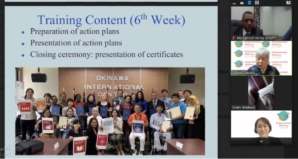 وتهدف هذه الدورة التدريبية إلى مساعدة المنظمات الحكومية، والمنظمات غير الحكومية، ومنظمات الأشخاص ذوي الإعاقة "DPOs" نحو تعزيز مسئولية المشاركة المجتمعية للأشخاص ذوي الإعاقة علي وضع خطط استراتيجية، والشروع في إجراءات جديدة من خلال إتاحة كسب سبل العيش، والعيش المستقل، وبرامج الدعم الأخرى، وذلك بناء على التعلم من تجارب ولاية أوكيناوا باليابان، ودول أخرى في هذا الشأن، وتم تصميم هذا البرنامج لحكومات المستوى المركزي والمحلي والمنظمات غير الحكومية ومنظمات الأشخاص ذوي الإعاقة "DPOs" المسؤولة عن الترويج للمشاركة المجتمعية، وسبل عيش الأشخاص ذوي الإعاقة، وبالإضافة إلى ذلك تهدف هذه الدورة التدريبية إلى تعزيز العلاقة بين المسؤولين الحكوميين والمنظمات غير الحكومية، ومنظمات الأشخاص ذوي الإعاقة؛ لتسهيل أنشطة كل منظمة.