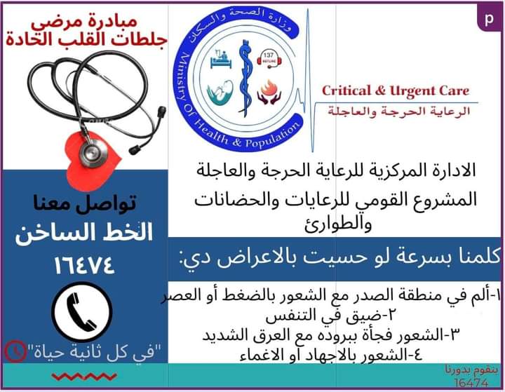 وقالت الإدارة المركزية للرعاية الحرجة والعاجلة: إن المشروع القومى للرعايات والحضانات والطوارئ يوفر خدمات الطوارئ لمرضى الجلطات القلبية.