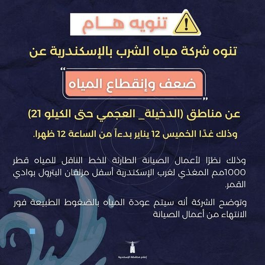 أعلنت محافظة الإسكندرية وشركة مياه الشرب قطع وضعف المياه بحي العجمي كاملًا بدءًا من الساعة ١٢ ظهر اليوم الخميس ١٢يناير، بسبب أعمال صيانة طارئة تتم في خط المياه الرئيسي بقطر ١٠٠٠مم الناقل للمياه غرب المدينة أسفل مزلقان وادي القمر.