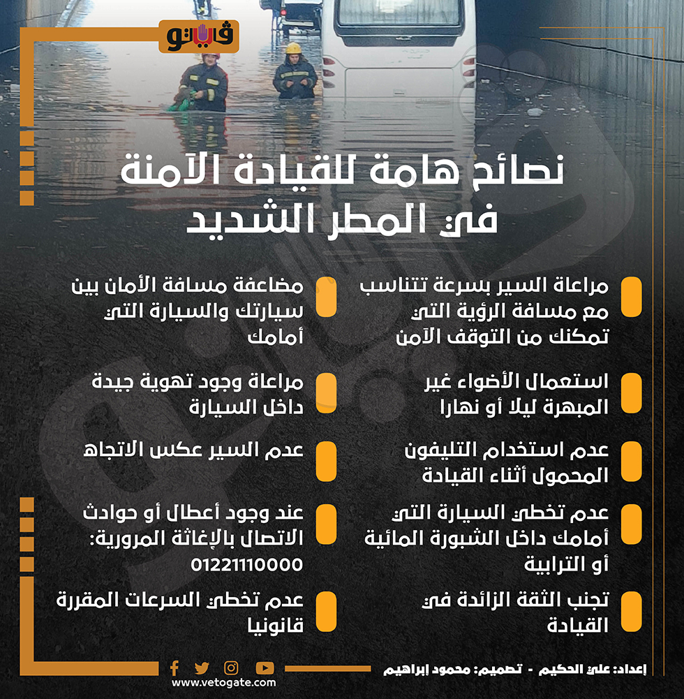 نصائح هامة للقيادة الآمنة في المطر الشديد (انفوجراف) الخميس 12/يناير/2023 - 01:21 م 1/12/2023 1:21:10 PM تعبيرية على الحكيم شارك طباعة 18 حجم الخط شارك طباعة الاغاثة المرورية الحوادث الظروف الجوية الشبورة المائية السير عكس الاتجاه