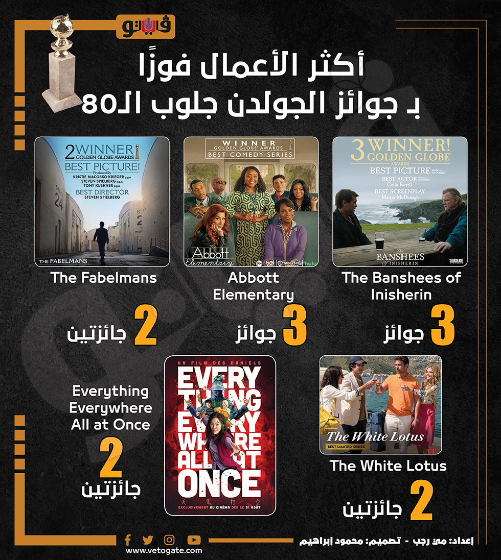 أكثر الأعمال فوزًا بـ جوائز الجولدن جلوب الـ80 (انفوجراف) الخميس 12/يناير/2023 - 02:14 م 1/12/2023 2:14:49 PM جولدن جلوب، فيتو مى رجب شارك طباعة 18 حجم الخط شارك طباعة جائزة جولدن جلوب جوائز جولدن جلوب جولدن جلوب جوائز جولدن جلوب 2023 جولدن جلوب ٢٠٢٣