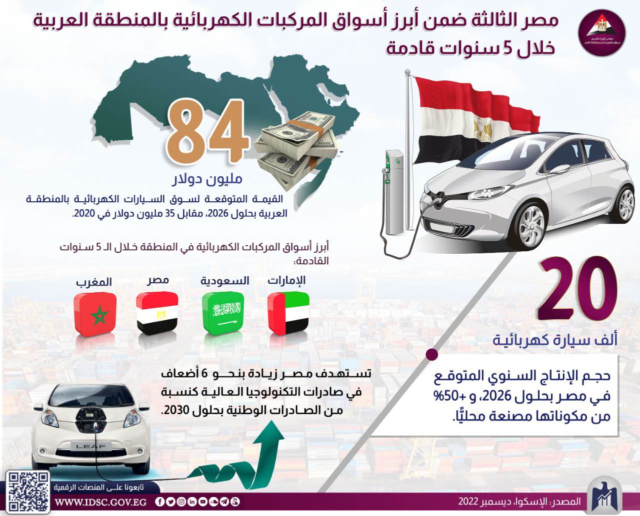 نشر مركز معلومات مجلس الوزراء المصري إنفوجرافيك جديدا بعنوان: "مصر الثالثة ضمن أبرز أسواق المركبات الكهربائية بالمنطقة العربية خلال 5 سنوات قادمة"