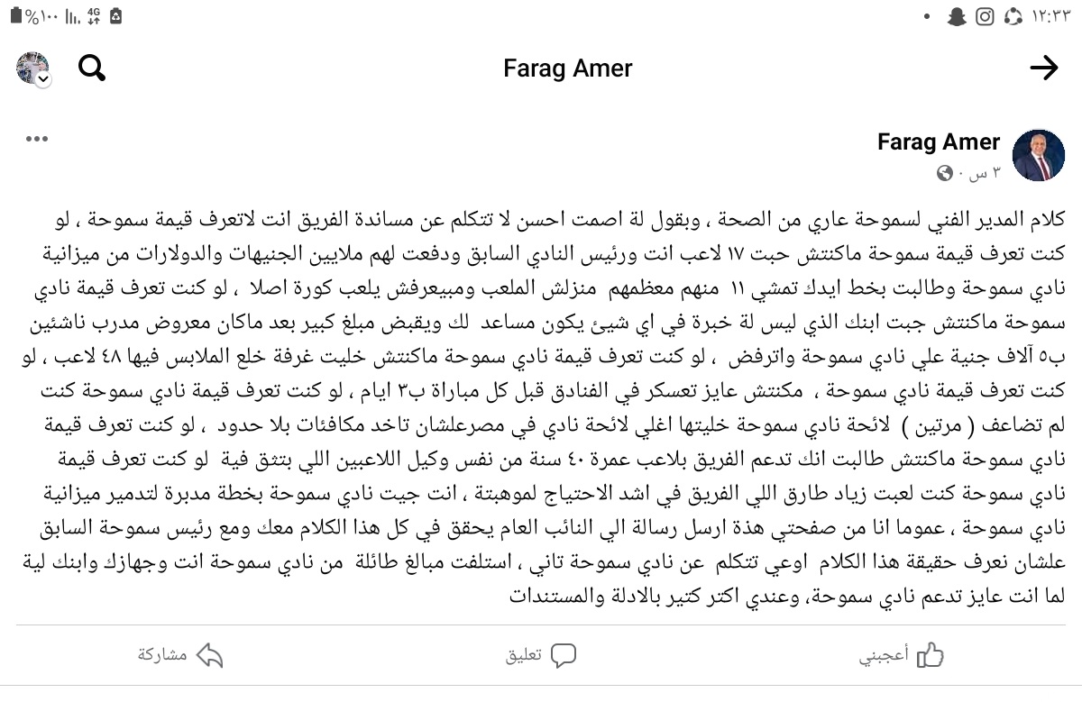 واختتم رئيس سموحة هجومه:" عموما انا من صفحتي هذه ارسل رسالة إلى النائب العام يحقق في كل هذا الكلام معك ومع رئيس سموحة السابق علشان نعرف حقيقة هذا الكلام اوعى تتكلم عن نادي سموحة تاني، استلفت مبالغ طائلة من نادي سموحة انت وجهازك وابنك ليه لما انت عايز تدعم نادي سموحة، وعندي اكتر كتير بالأدلة والمستندات".