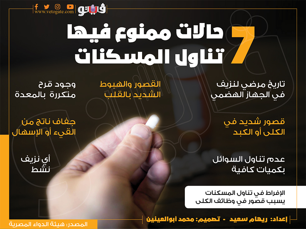 7 حالات ممنوع فيها تناول المسكنات (انفوجراف) الجمعة 13/يناير/2023 - 05:38 م 1/13/2023 5:38:33 PM موانع استخدام المسكنات ريهام سعيد شارك طباعة 18 حجم الخط شارك طباعة هيئة الدواء المصرية تناول المسكنات وظائف الكلى الجهاز الهضمي
