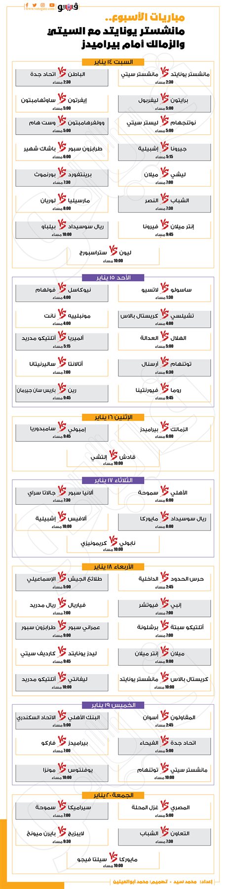 مباريات الأسبوع، مانشستر يونايتد مع السيتي، والزمالك أمام بيراميدز (إنفوجراف) الجمعة 13/يناير/2023 - 02:50 م 1/13/2023 2:50:55 PM مباريات الاسبوع، فيتو محمد سيد شارك طباعة 18 حجم الخط شارك طباعة الأهلي الزمالك مانشستر يونايتد ليفربول بيراميدز ميلان النصر