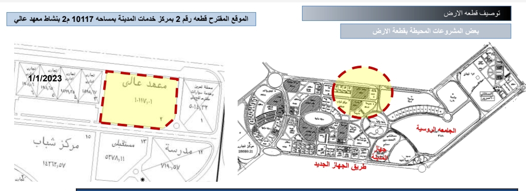 قطعه رقم 2 بمركز خدمات المدينة بمساحة 10117م2 بنشاط معهد عالي وسعرها التقديري 3050 جنيه مصري للمتر²