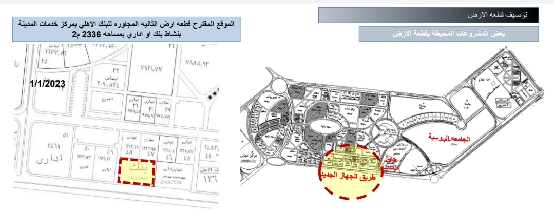 قطعه ارض الثانية المجاورة للبنك الاهلي بمركز خدمات المدينة بنشاط بنك او اداري بمساحه 22336 وسعرها التقديري 9190 جنيه مصري للمتر²