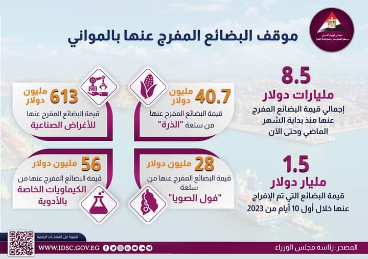الإفراج الجمركي، نشر مركز المعلومات ودعم اتخاذ القرار بمجلس الوزراء إنفوجراف جديد عبر صفحته الرسمية على موقع التواصل الاجتماعي فيسبوك تحت عنوان "موقف البضائع المفرج عنها في الموانئ"