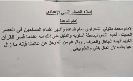 وجاء نص قطعة إملاء امتحان اللغة العربية لطلاب الصف الثاني الإعدادي كالتالي:"إمام الدعاة، الإمام محمد متولي الشعراوي، إمام الدعاة وأشهر علماء المسلمين في العصر الحديث، أحبه الناس لبساطة أسلوبه، والدليل على ذلك أنه عندما فسّر القرآن الكريم فهمه الجاهل والعارف، وبالرغم من أنه رحل عن عالمنا، فإنه ما زال حيًا بعلمه لأن المال يفنى والعلم يبقى".