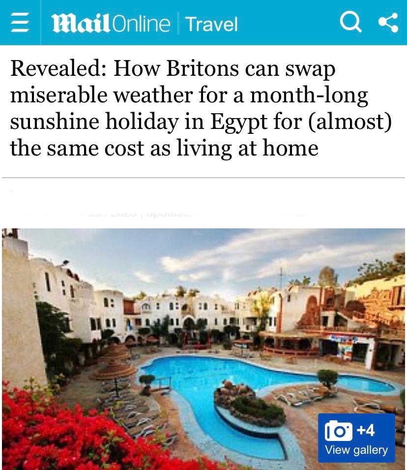 وأكد التقرير الذي نشرته صحيفة ديلي ميل البريطانية، أن المقصد السياحي المصري يتيح للسائحين البريطانيين إمكانية قضاء أجازة طويلة به بتكلفة منخفضة، داعيًا البريطانيين للهروب من الطقس البارد في بريطانيا خلال فصل الشتاء والسفر إلى مصر لقضاء أجازة ممتعة بالمدن السياحية بها حيث الطقس المشمس الدافئ، لمدة قد تصل إلى شهر بنفس تكلفة إقامتهم فى منازلهم بموطنهم.