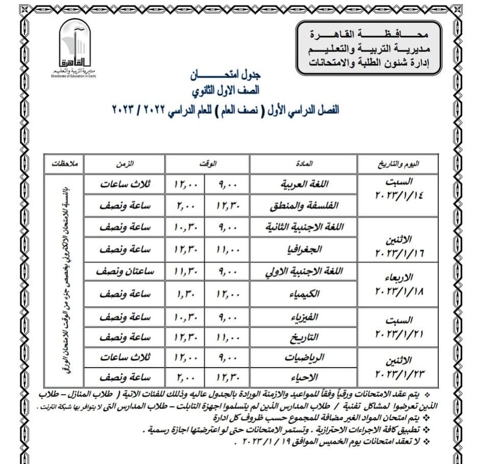 كما نص الخطاب على أنه يتم أداء جدول امتحانات الصف الأول الثانوي على النحو التالي: